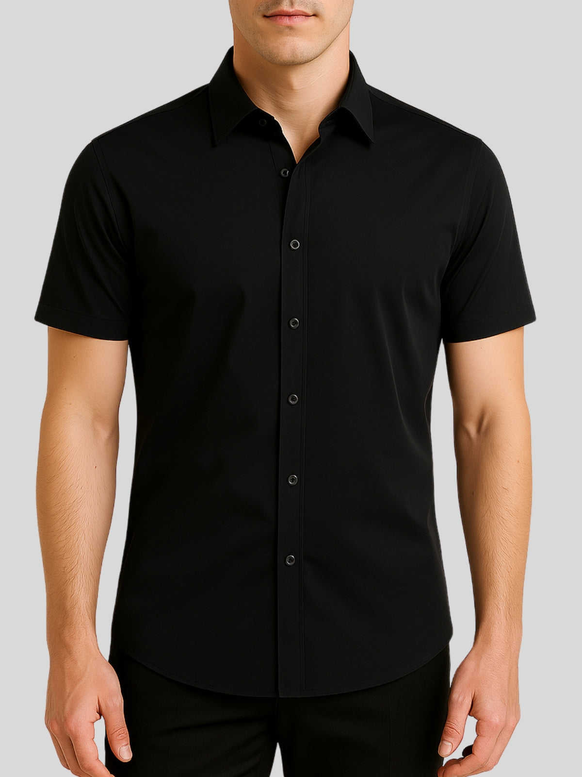 Of je nu naar kantoor gaat, een avondje uit plant of gewoon op zoek bent naar een nette, comfortabele look – dit zwarte overhemd met korte mouwen is jouw nieuwe favoriet.